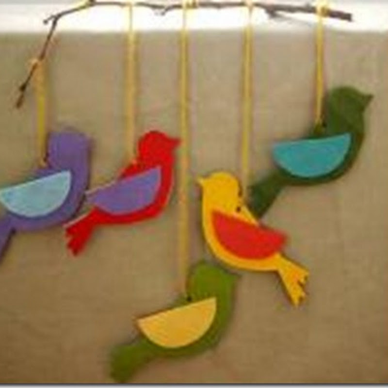 Enhebrar el hilo a través de los agujeros perforados en la parte superior de cada ave; ate las cinco aves a la rama. Corte el hilo que sobre.